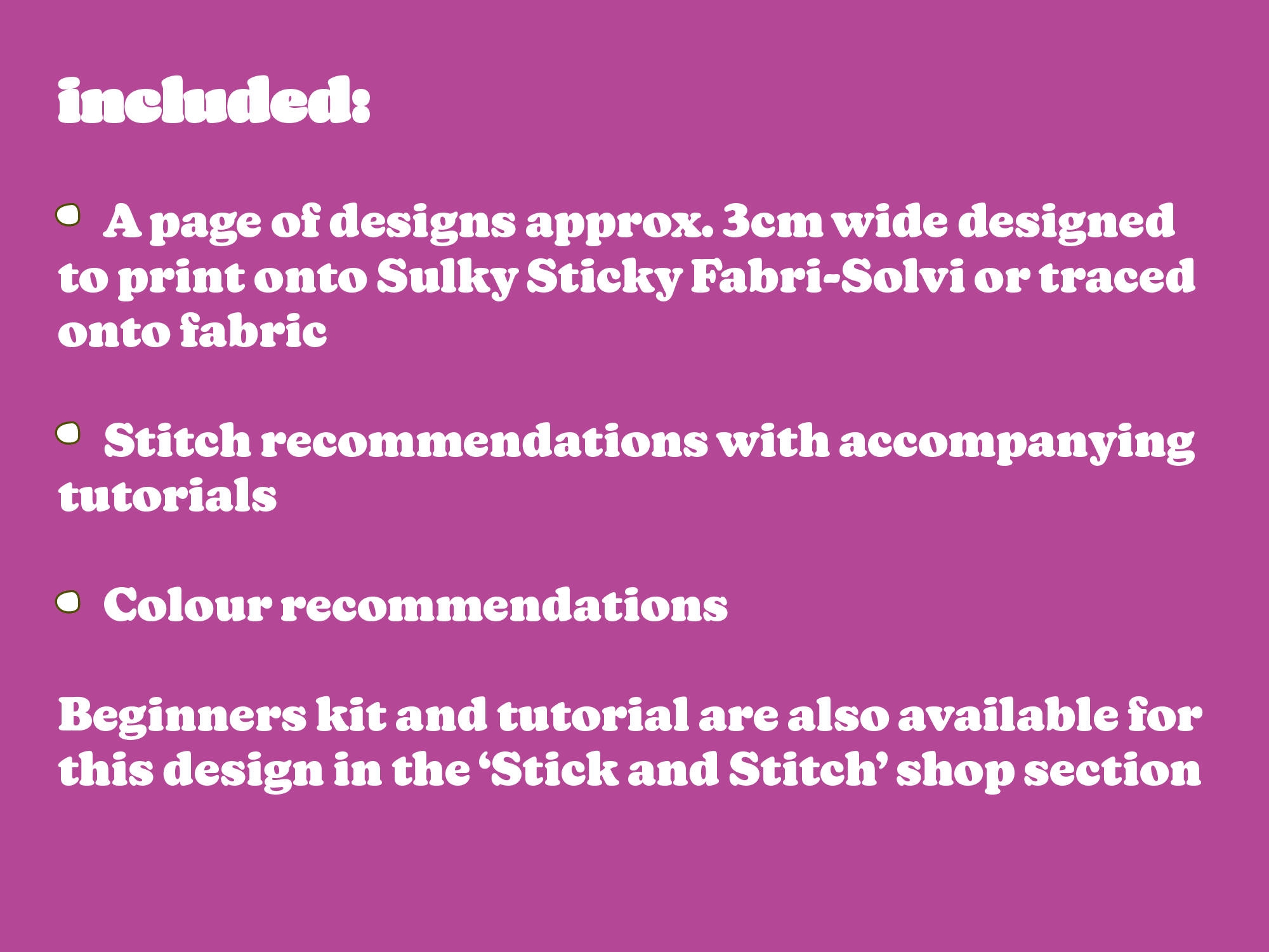 For the love of the colourful friends that share their home with us! Previous embroidery experience is recommended as this is just a PDF pattern download. Included is a 'Letter' size page containing 16 identical embroidery patterns that are designed to be printed onto a Sulky Sticky Fabri-Solvy sheet. This page can also be printed and the design traced onto fabric by hand! There is also a stitch guide with stitch and colour recommendations, as well as a tutorials for the stitches required to complete the design.