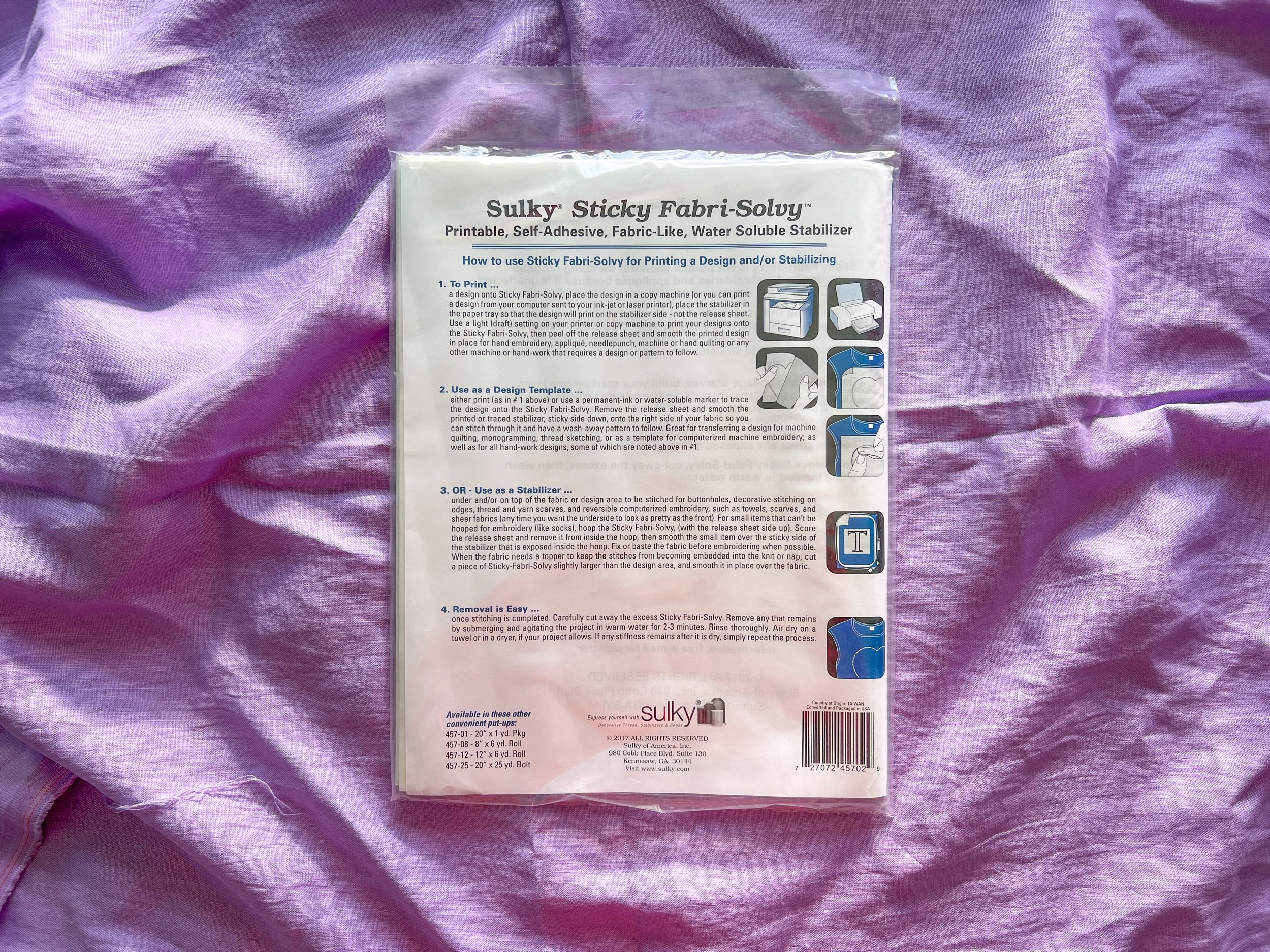 Self adhesive interfacing that can be printed on or used to trace onto. Washes way with plain water. Perfect for transferring embroidery designs. 12 sheets per pack that are standard letter size.
